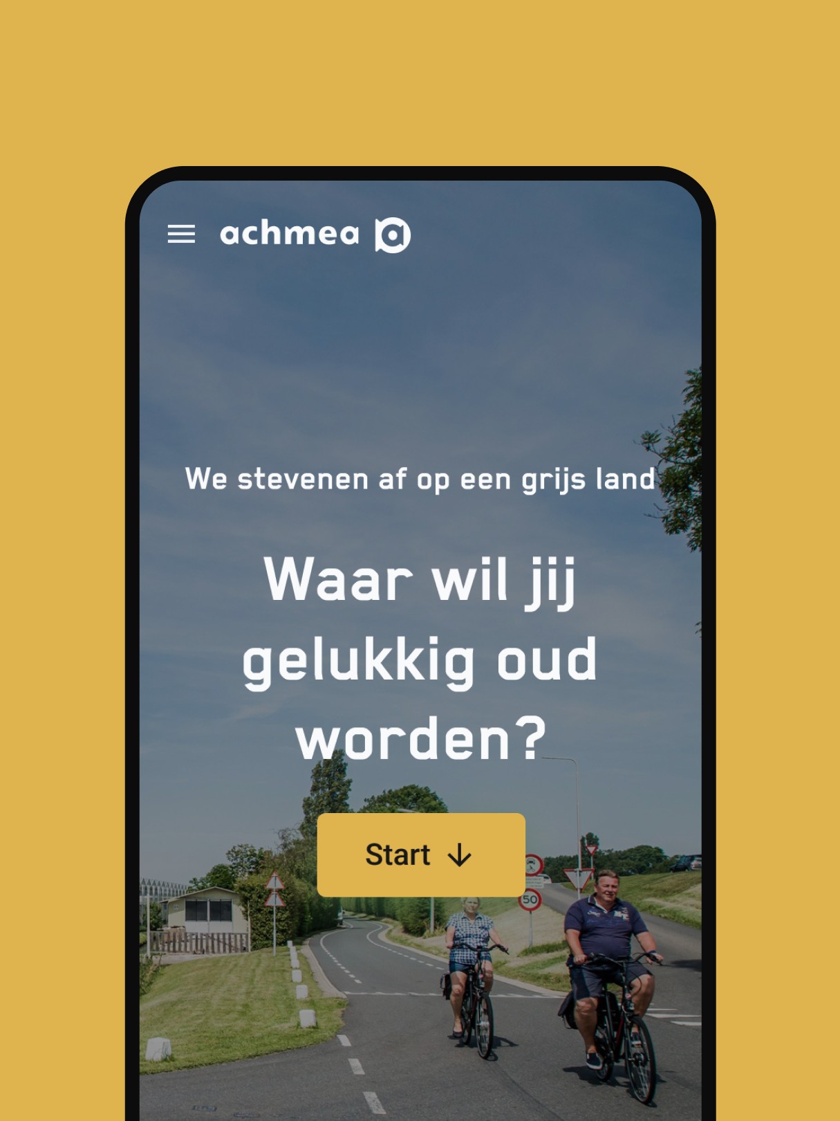 An award-winning film was produced for their new brand vision, ‘sustainable living together’, the Achmea way. A small group of stakeholders was invited to participate in three workshops to understand, define and ideate on a suitable approach to align the digital strategy with Achmea’s mandate. Context-mapping and a concept car concluded in showcasing their commitment through a brand-new series of microsites.