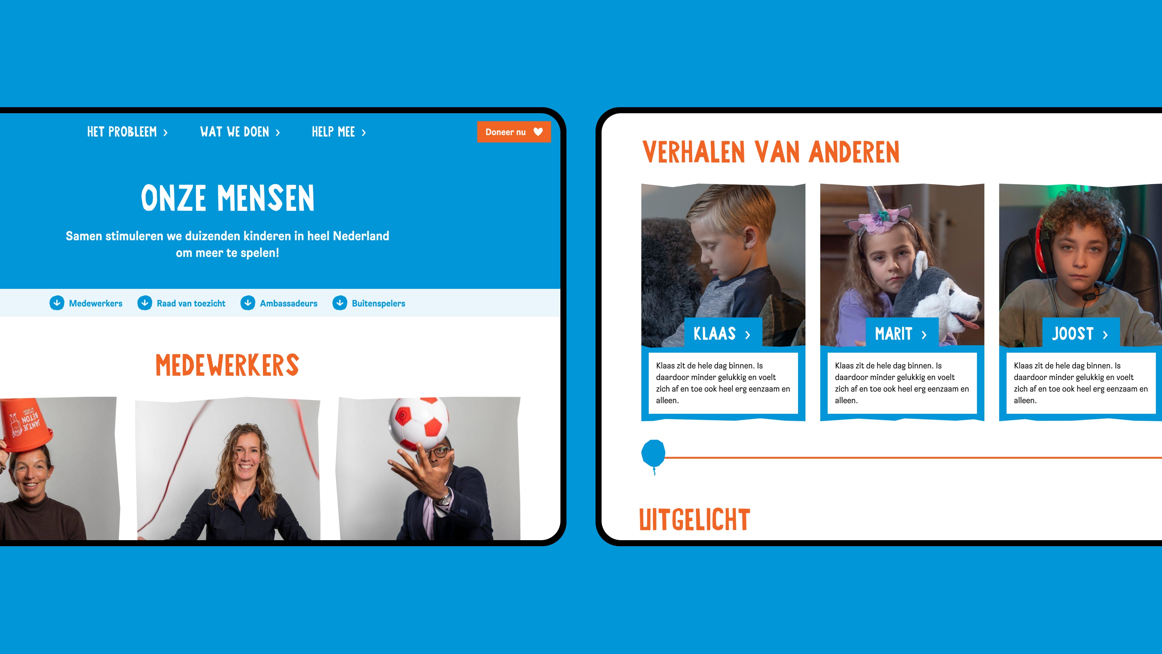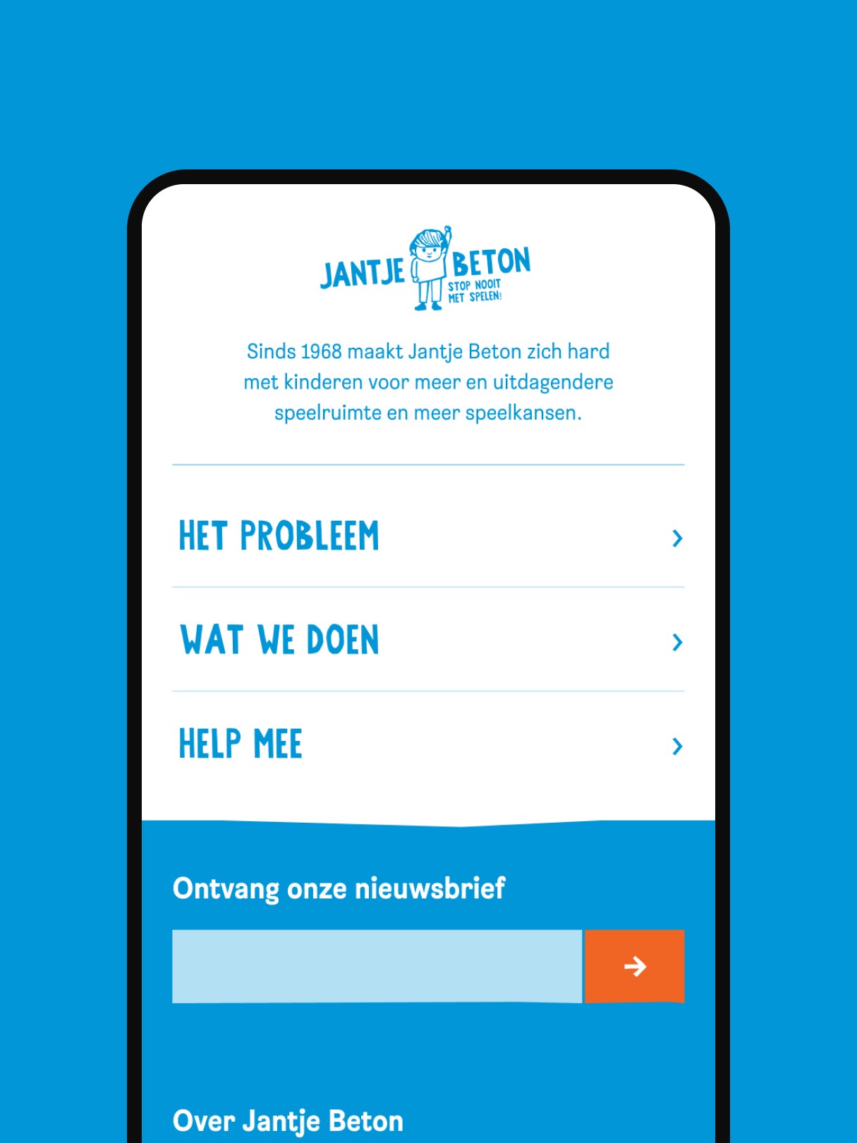 Since 1968, Jantje Beton has been working tirelessly to create more play spaces where all children can play today, for a happy, healthy generation tomorrow. To increase engagement, I pitched conceptual ideas and design rationale both verbally and visually, helped facilitate the design process with 10 client-side stakeholders, and supported implementing the final design work. Resulting in a flat navigation and refined information architecture for their website.