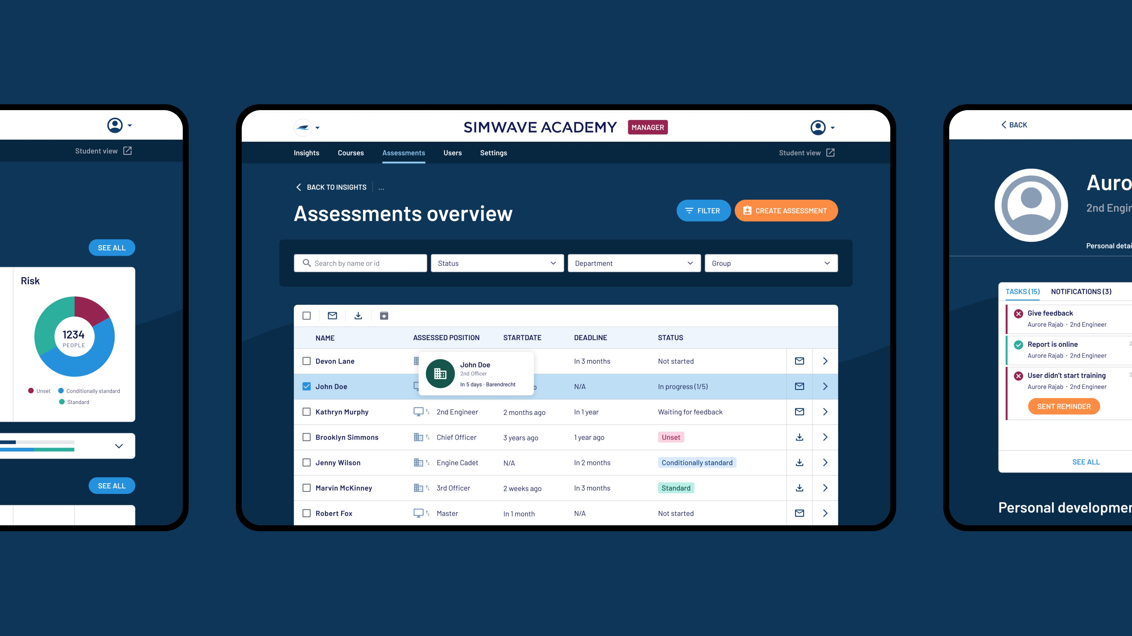 From the dialogue with Simwave’s clients (i.e. early adopters), the need arose to monitor crew members, also due to the training demands an admirable investment from their side. That’s why, in the end, I spent close to a year on designing the manager-side, including Insights, Course-, Assessment-, User, and Settings management to help management grasp where a crew is in their learning journey.